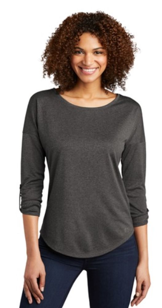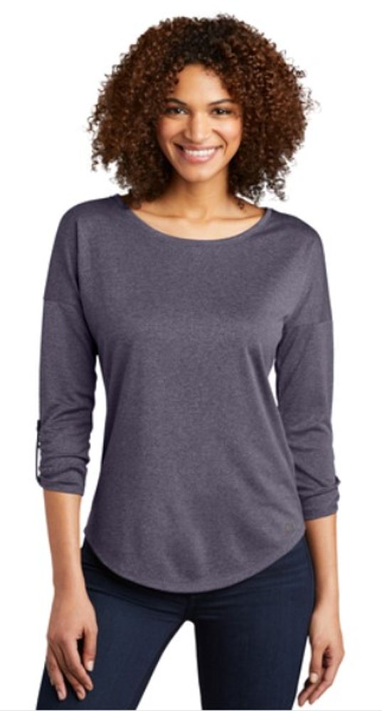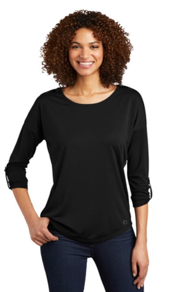 This flattering look has a beautiful drape and on-trend OGIO style. It features 100% polyester moisture wicking technology, dolman shoulders, self-fabric sleeve tabs with black buttons, curved hem, and OGIO branding.