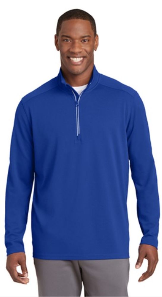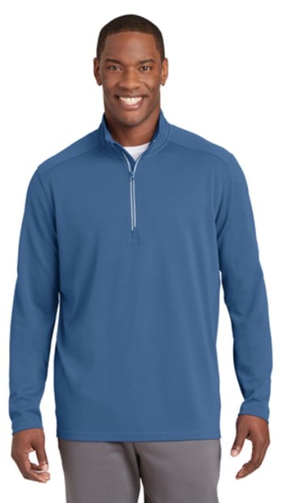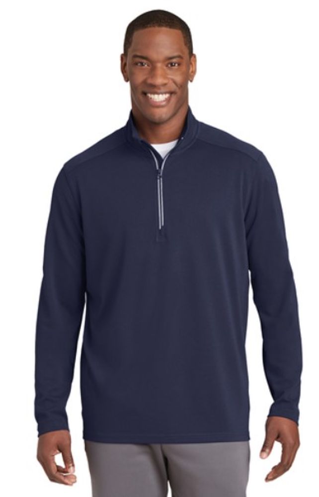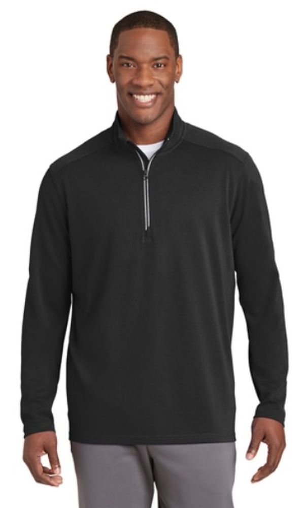 This mid-weight pullover has an unbeatable textured look with contrast zipper taping. It performs by wicking moisture and looks great for the office or the gym. Features include 100% polyester fabric, cadet collar, silver zipper tape, angled chin guard, and open cuffs/hem.